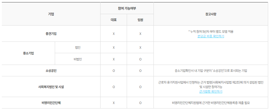 2024년부터는 민간 비중의 점진적인 확대를 위해 누적 참여 5년 차부터 중견기업을 대상으로 신규 모델을 운영하게 되었습니다. 누적 참여 5년 차 이상 중견기업에서는 본인 부담금 20만 원 기업 지원금 15만 원 정부 지원금 5만 원을 더해 총 50만 원의 휴가비를 적립하게 됩니다.
