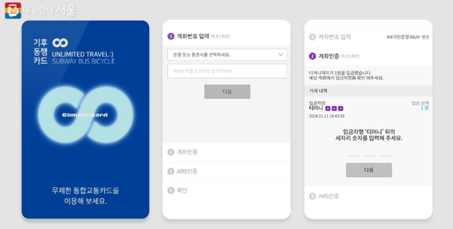 서울지역 지하철 및 서울시 면허 시내버스 마을버스, 따릉이를 이용할 수 있다.